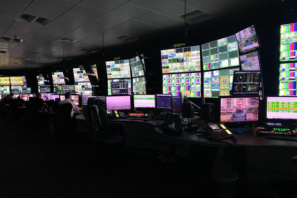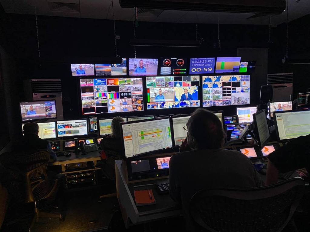 Moving inside the newsrooms, multiple galleries can be found. In this image, producers, vision mixers, light, and sound technicians are situated in a gallery. From this perspective we can observe them working diligently to produce the final image we see on TV. Although each individual is responsible for different tasks, they must be collaborative and dynamic as all their work is interdependent.
