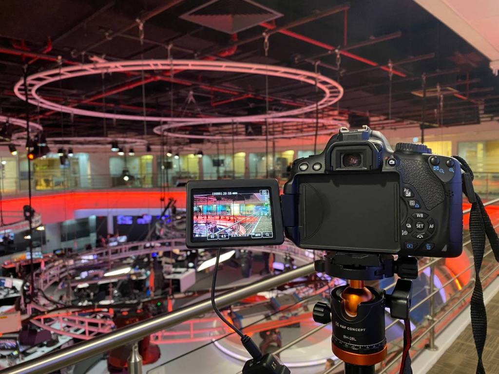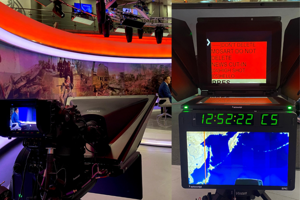 This shot gives another perspective from the opposite side of the room. In focus is the TV presenter, who is seen through the Autoscript machine which can also be viewed by him so that he knows what is currently broadcasting on TV. The Autoscript machine, an AI tool, recognizes speech to adjust the scrolling speed of the script according to the presenter’s delivering pace. Thus, this tool ensures that the presenter’s delivery is natural and effortless for the broadcast.